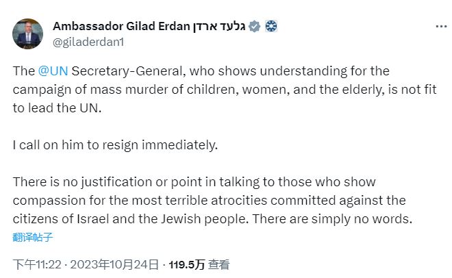 联合国秘书长古特雷斯在联合国安理会再次呼吁停火并提到了巴勒斯坦被占领的历史。他的发言引发以色列强烈抗议,以色列驻联合国代表要求古特雷斯立刻道歉,否则就辞去联合国秘书长之职。