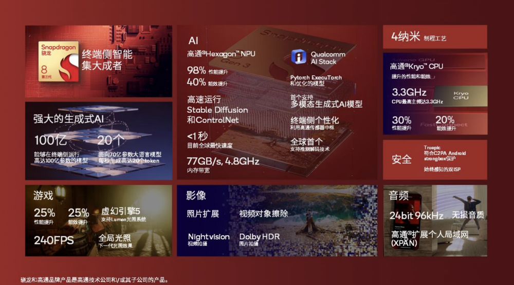 此前,高通公司宣称骁龙8 Gen 3是首款专为生成式AI而设计的移动平台,也是市场上最强大和功能最齐全的移动平台,并表示骁龙8 Gen 3将会“挑战主机”和“高端级别”。