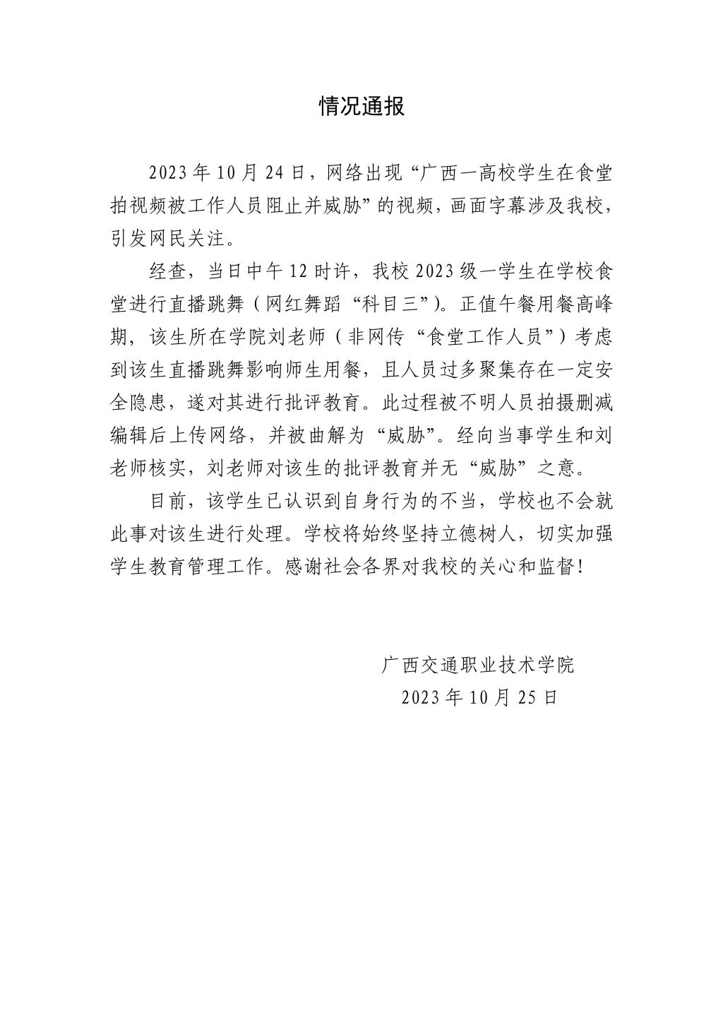 10月24日,网络出现“广西一高校学生在食堂拍视频被工作人员阻止并威胁”的视频,画面字幕涉及广西交通职业技术学院,引发关注。10月25日,广西交通职业技术学院就此事发布情况通报。