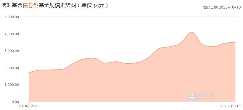 2022年三季度末,博时基金债券型基金规模为4091亿元,到了2023年10月10日,规模下降至3497亿元。其中,2023年一季度末,博时基金债券产品规模更下降至3249亿元。