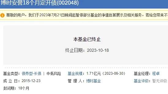2023年10月18日,博时基金一只名为“博时安誉18个月定期开放债券型基金”正式终止。