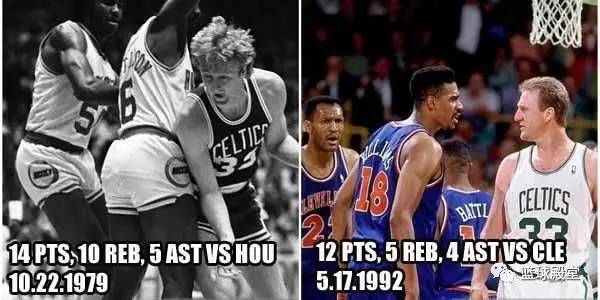 拉里·伯德首次亮相于1979年10月22日对阵休斯顿火箭队,第一场比赛的数据在NBA比赛往往是一个好的迹象,并成功入选名人堂。但是他在最后一场比赛并不令人印象深刻,然而对于一位36岁的老球员来说,这也算是一个不错的数据了。