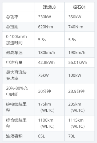 不只是价格和竞品短兵相接,在设计方面,定位于硬派越野的极石01,和理想的设计语言高度相似,配置上相似度也较高。以售价33.98万元的理想L8 Air和售价34.99万元的极石01 7座版为例,其基础参数相差较小。