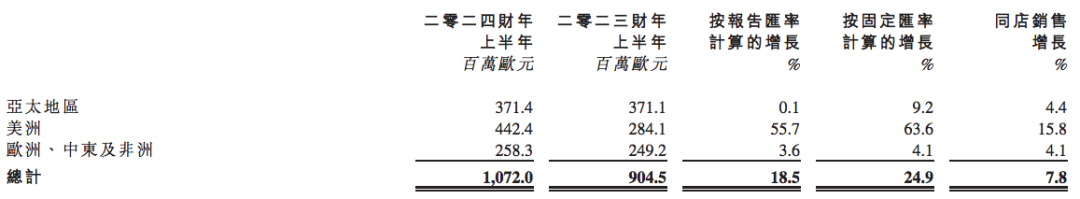 2024财年上半年,录得净销售额10.72亿欧元(约合人民币83亿元),按报告汇率计算增长18.5%,按固定汇率计算增长24.9%。