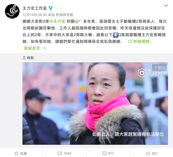 日前,王力宏在商演时被矿泉水瓶砸中腹部,随后王力宏工作室发布了微播。从王力宏工作室发布的视频来看,袭击者高瑞霞可能是王力宏的一名极端歌迷,她多年来在多个场合攻击,骚扰王力宏及其工作人员,妄想自己是王力宏妻子,大声质问王力宏:“我们在一起五年了,为何不敢面对我。”