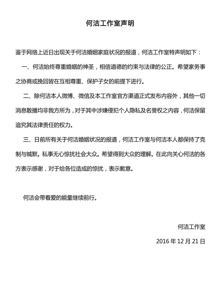 今晚,何洁借由何洁工作室首度发声,称希望家务事之协商或挽回皆在互相尊重、保护子女的前提下进行。还表示私事无心惊扰社会大众,希望得到大众的理解。