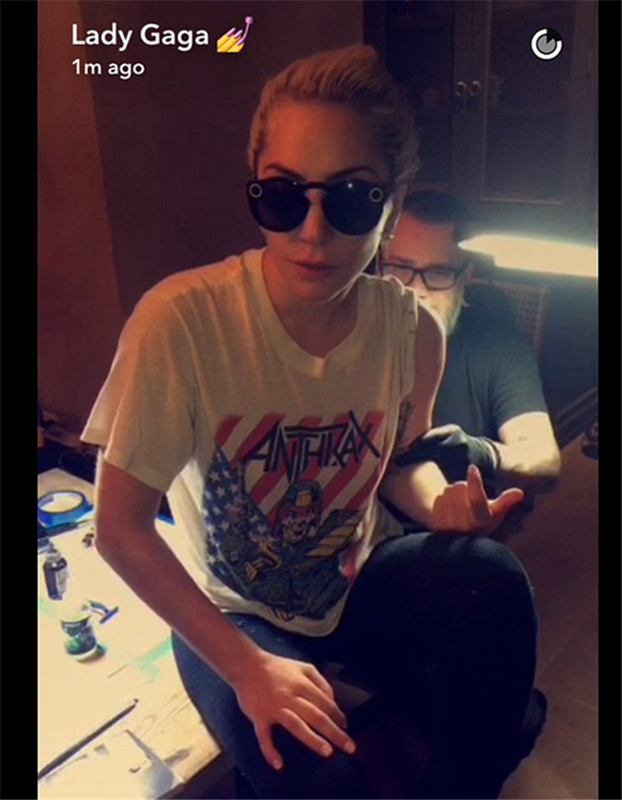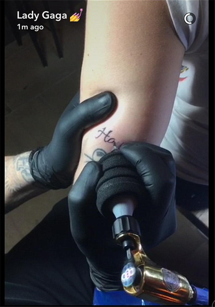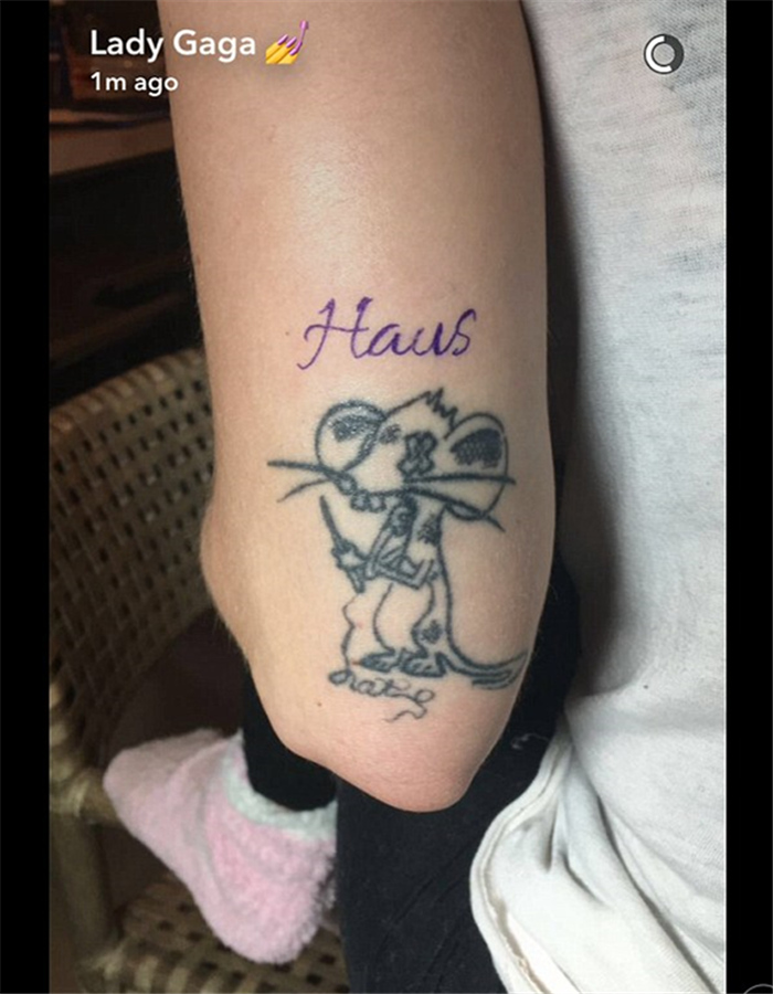 Lady Gaga在Snapchat将纹身过程以直播的形式分享给粉丝们。“Haus”这个词代表了Gaga对造型团队每一位成员的感谢之情。这块纹身用的是紫色墨水,位于献给妹妹娜塔莉的老鼠纹身之上,它也成为了Gaga身上的第20处纹身。