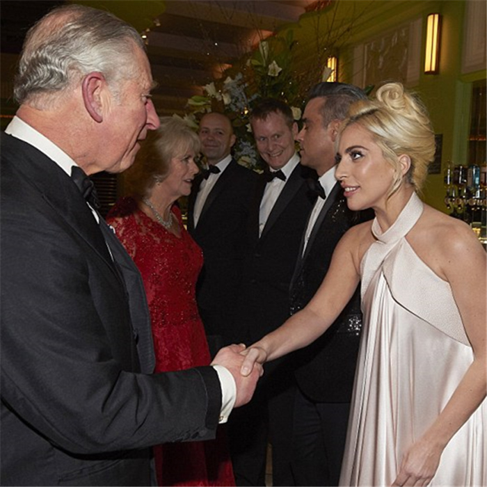 在晚会开始前,Lady Gaga和天王罗比·威廉姆斯一道获得了查尔斯王子和卡米拉王妃的接见。