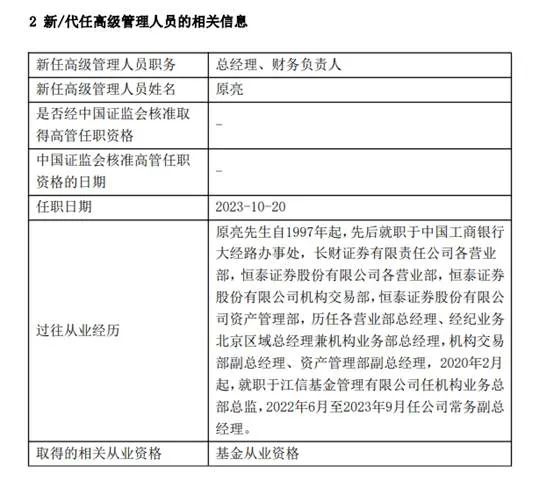 10月20日,江信基金发布高级管理人员变更公告,焦毛因个人原因离任总经理与代任督察长职务;原副总经理原亮转任总经理、财务负责人。同日,郑清丽离任副总经理、财务负责人,转任督察长;遇浩亮任副总经理。