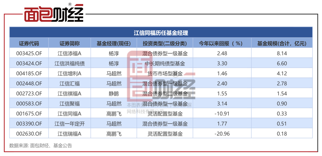 研究发现,下半年以来,江信基金旗下基金经理离任频繁。其中,基金经理杨鹏飞在离任江信增利货币、江信汇福定开债后,于10月17日再度离任江信添福。公告显示,杨鹏飞已因个人原因离职。
