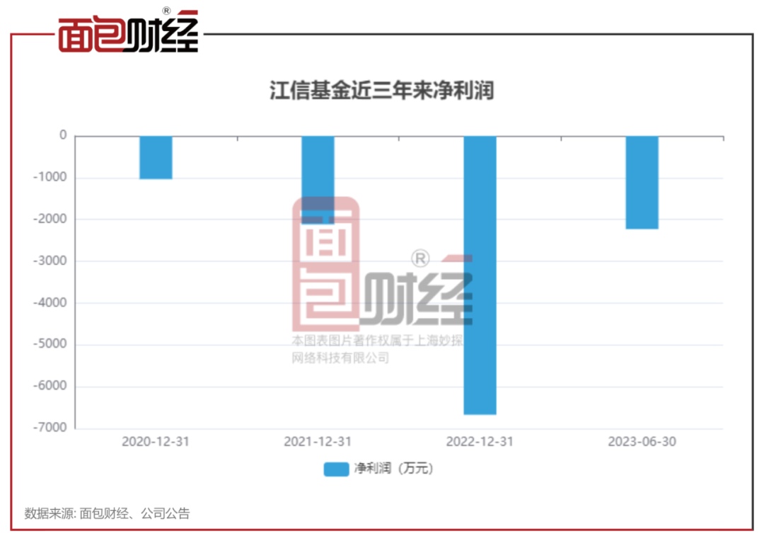 此外,江信基金自2020年以来净利润持续亏损。根据披露信息,江信基金2021年净利润亏损2115.89万元,2022年亏损扩大,净利润为-6671.15万元。2023年上半年,江信基金亏损2229.97万元。