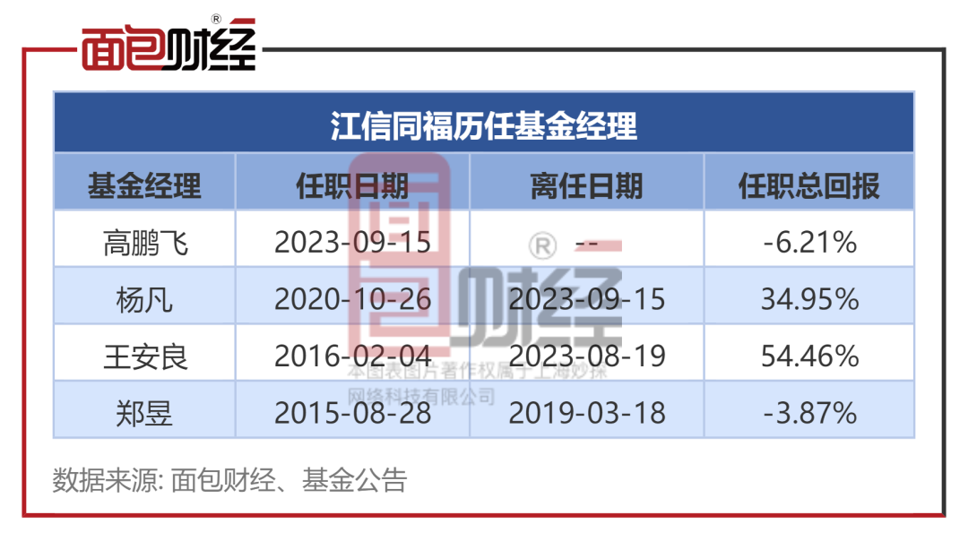 江信同福的基金经理为高鹏飞,2023年9月接手该基金。数据显示,成立8年以来,江信同福已历任4位基金经理,其中基金于今年8月以来相继解聘基金经理王安良、杨凡。