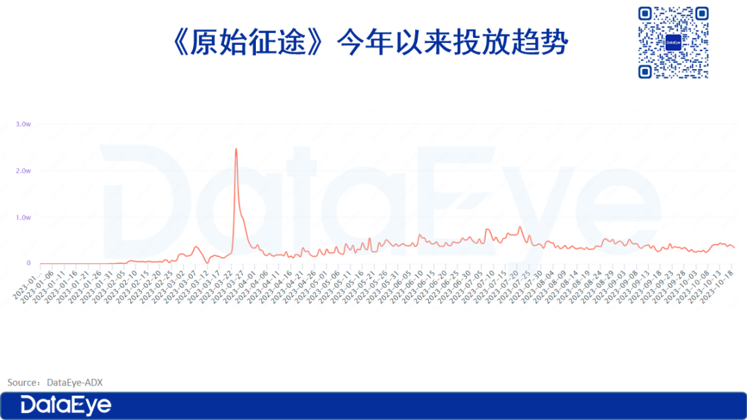 进入《原始征途》上线预热阶段,增加投放——3月24日当天,投放计划数(次数)、素材量都呈现飙升状态。