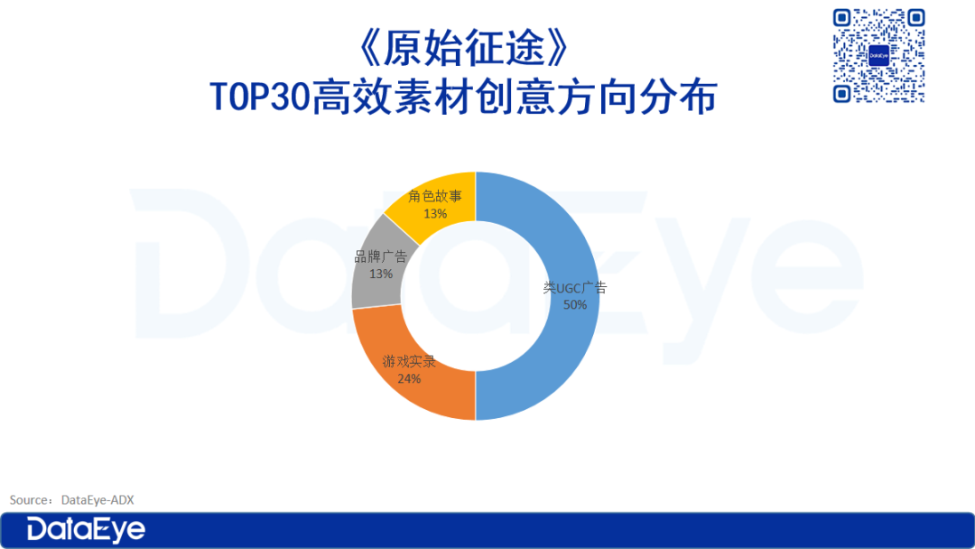 2023年来(截至10月19号)高效素材TOP30视频素材中,《原始征途》的高效素材主要以“类UGC短片”(类原生视频、实录+口播)为主要创意形式包装素材,占比超半数。而“游戏实录”占比为23%,排名第二。同时项目组也做了一些品牌广告和游戏角色故事。