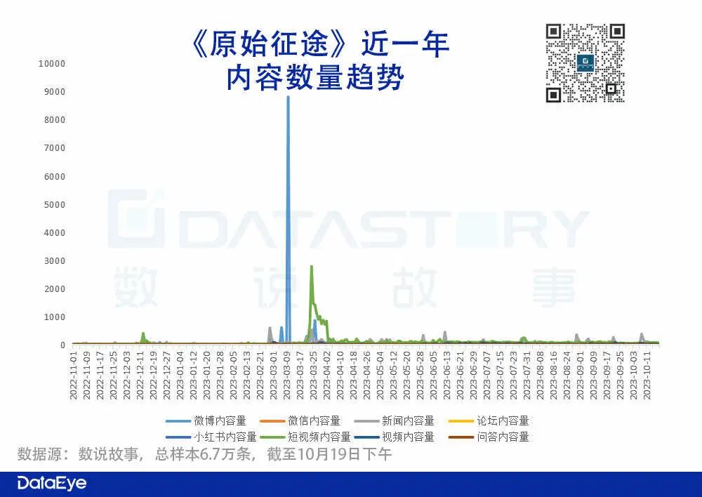 内容条数方面:截止至10月19日,全网内容条数达到6.7万条,其中形成2次内容爆发增长,均在游戏上线前后。