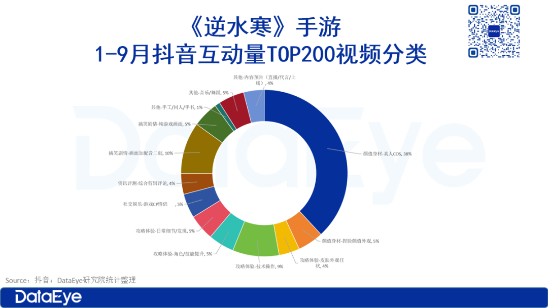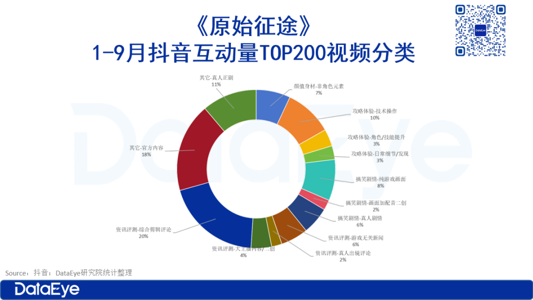 3、受众感知:多元内容信息触达受众,不再有统一调性、记忆点,单一“高大上”品牌、单一品牌核心概念成为历史。围绕游戏,微博、短视频里千面、多元、杂糅的信息传播成为常见现象。以下是DataEye研究院统计的1-9月《逆水寒》手游、《原始征途》TOP200互动量(赞转评收藏)的抖音视频类别,可以看出种类多元、“百花齐放”。