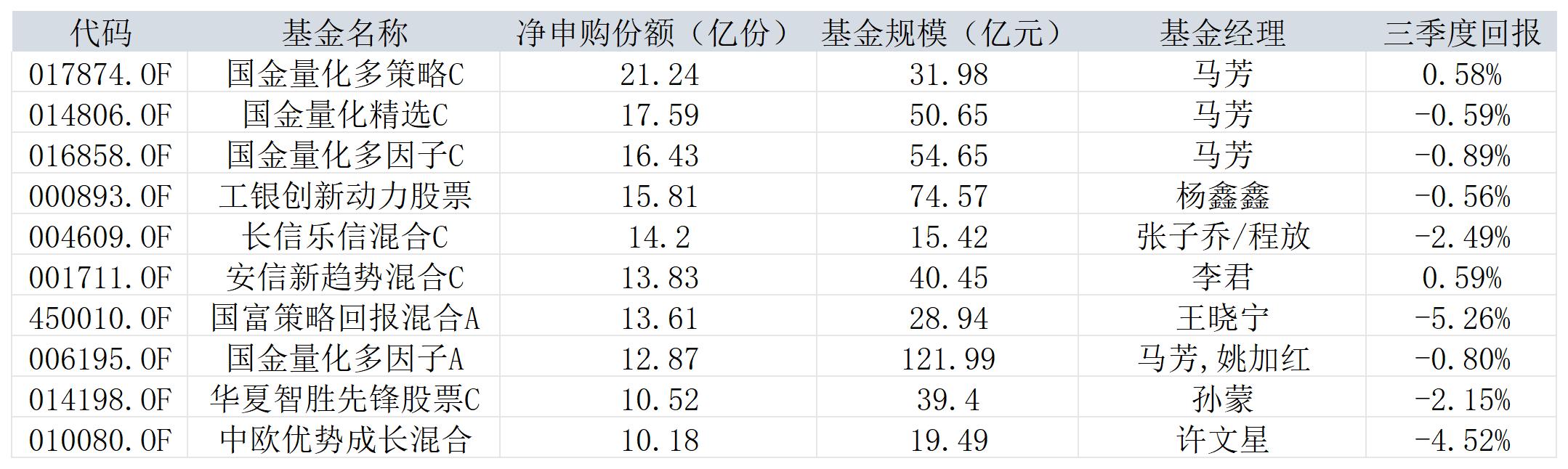 此外,安信新趋势混合C、国富策略回报混合A、华夏智胜先锋股票C、中欧优势成长混合三季度均获得10亿份以上净申购。