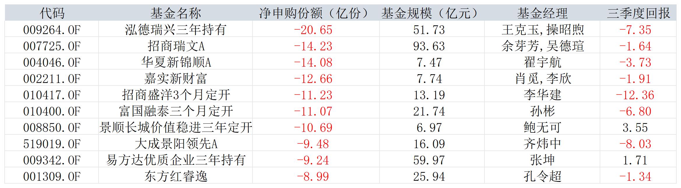 泓德瑞兴三年持有期混合、招商瑞文混合A、华夏新锦顺混合A等7只主动权益基金被赎回超过10亿份。