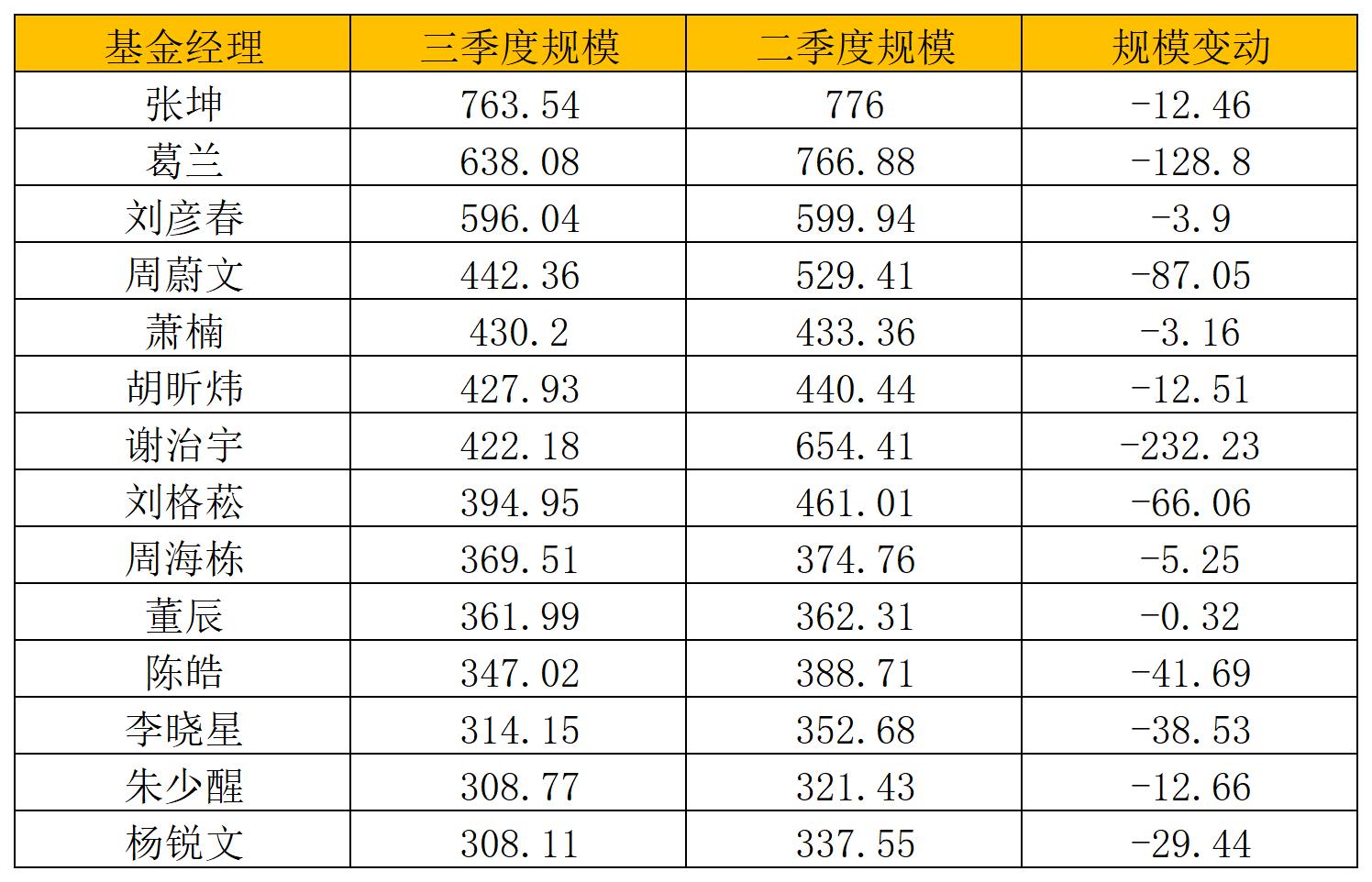 曲扬、归凯、傅友兴、陆彬、傅鹏博、朱璘等多位知名基金经理的规模则从300余亿元缩水至200-300亿的区间。