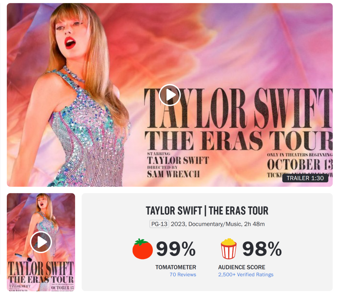 在北美,《泰勒·斯威夫特:时代巡回演唱会》(以下简称《泰勒·斯威夫特》)首映便超过9千万美元,并收获媒体和观众的“满分”好评,以一己之力扭转秋季档的低迷市况。
