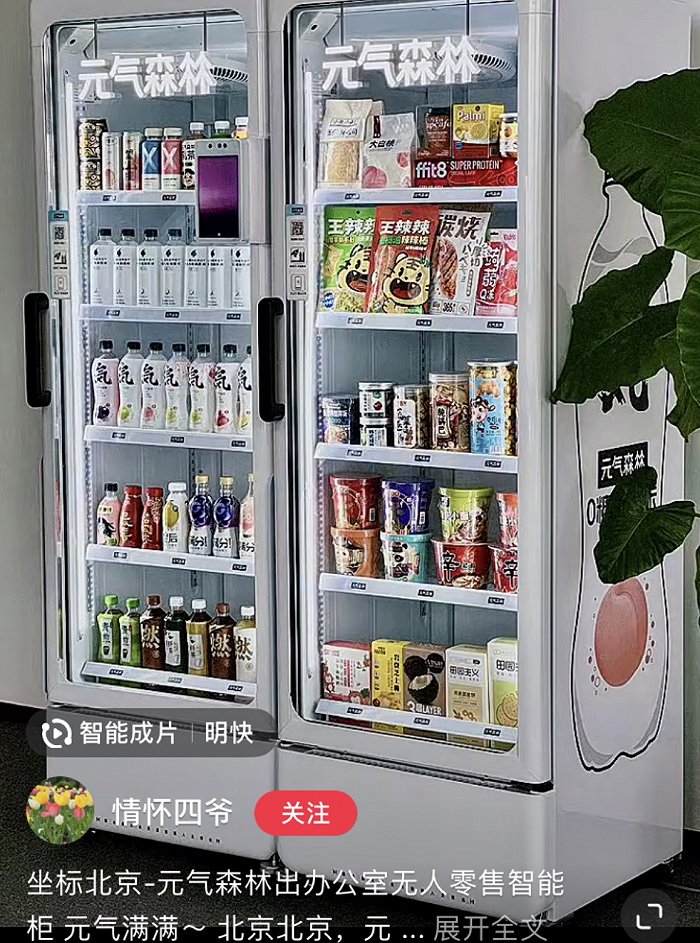 界面新闻此前报道称,早在2021年下半年,元气森林就开始了智能柜的布局。有醒目“元气森林”标志的智能柜进入了不少写字楼和社区的前台或者大厅。小红书、抖音等社交平台也有元气森林无人智能零售设备免费申请的宣传。