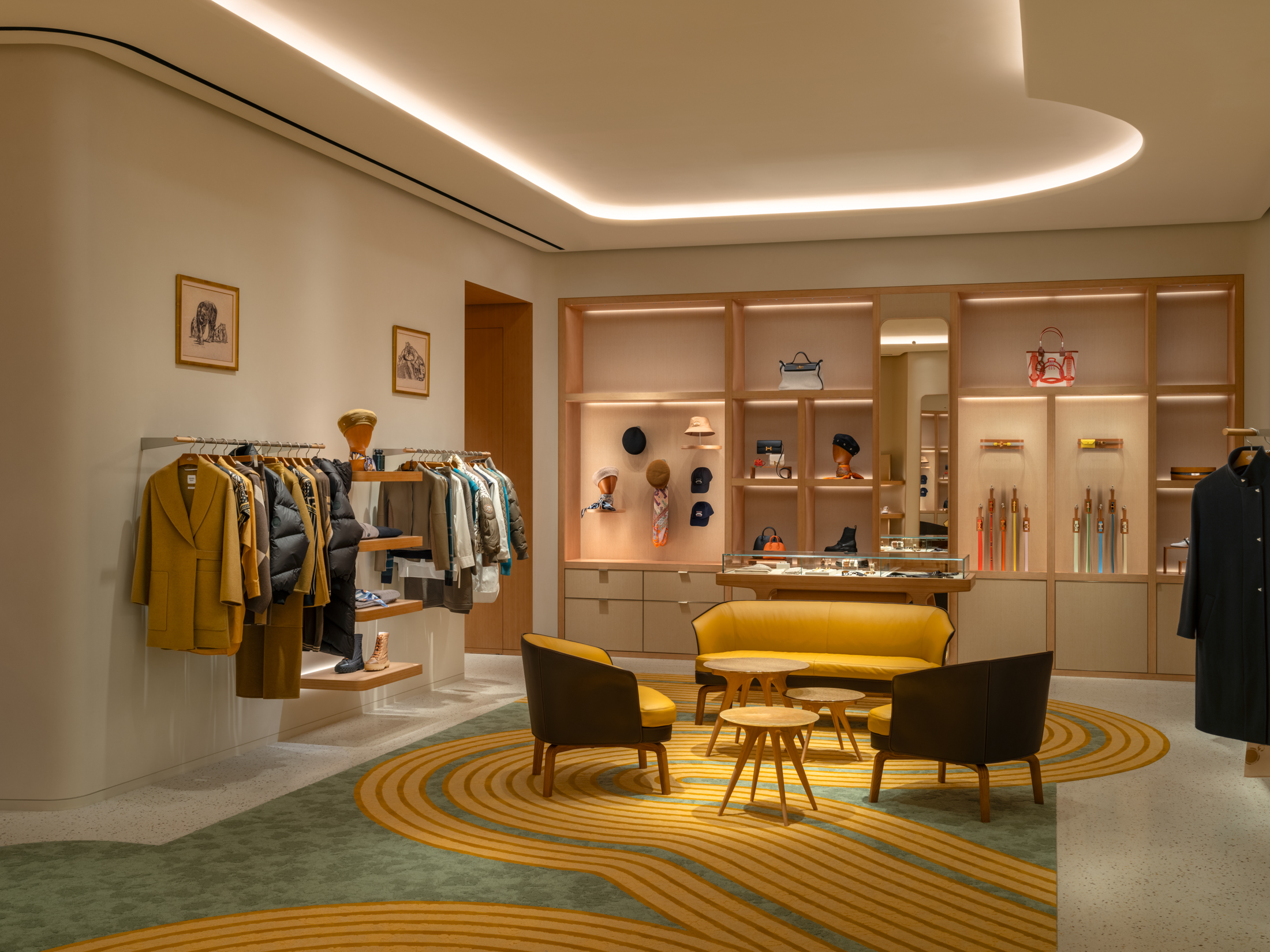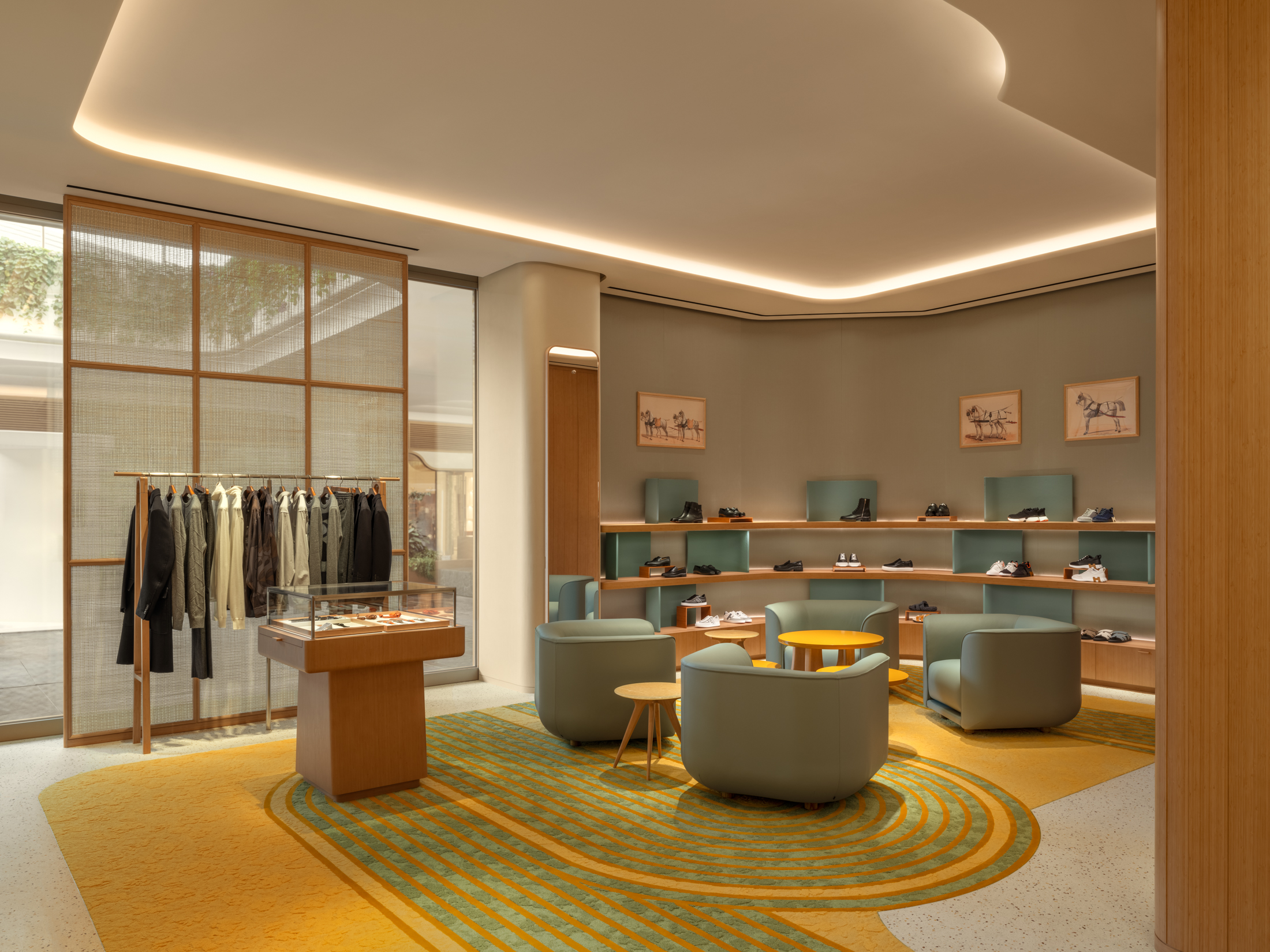 新店分为上下两层,设有完整的对外入口。首层笼罩于标志性希腊式琉璃顶灯的柔和光芒之中,顾客可在此领略男士丝织品及马术配件的风采,随后步入家居系列陈列区。左侧空间为男士成衣与鞋履区域,右侧则为包袋与小皮具区。楼梯后方的整面墙壁均覆以柳条编织,营造温馨宜人氛围,致敬源远流长的竹编技艺。
