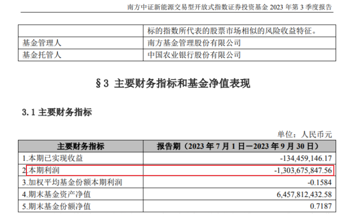 独角金融梳理发现,第三季度,南方中证新能源ETF成为347只产品中亏损较为严重的一只,第三季度亏损13.04亿。回顾今年前三季度业绩表现,加上上半年亏损的6.14亿元,三个季度该只产品亏损高达19.18亿元。