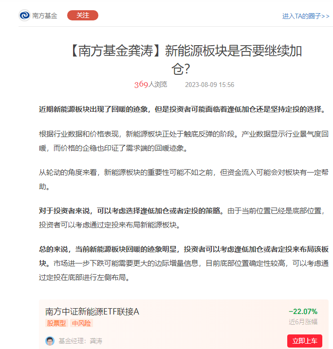 南方中证新能源ETF由基金经理龚涛管理。面对持仓以新能源为主的基金,接下来是否要在该板块继续加仓?