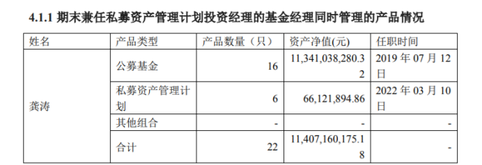 值得注意的是,从三季报披露的数据看,龚涛除了管理16只公募基金、总计113.4亿的规模外,自2022年3月10日起,其还管理着6只私募基金,资产规模为6612万元。