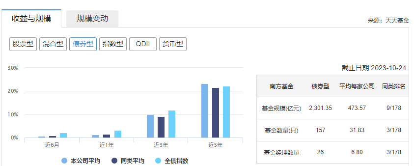 相比其他类产品,南方基金债券类产品业绩表现较为优秀。截至目前,南方基金管理债券型基金157只,总计规模2301.35亿元,从业绩表现看,近3年、近5年均高于同类平均水平。
