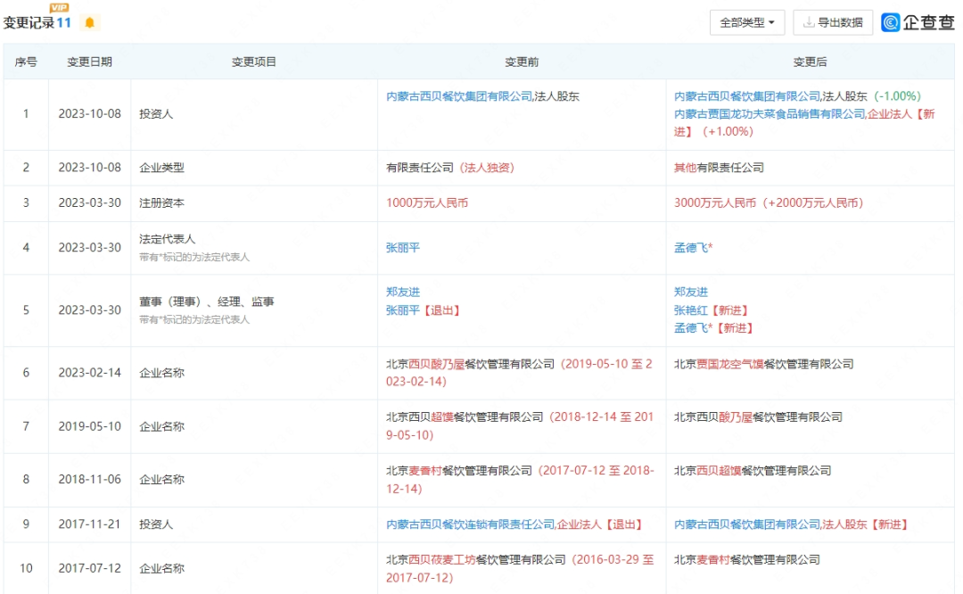 2019年5月,北京西贝超馍餐饮管理有限公司更名为北京西贝酸乃屋餐饮管理有限公司,6月其首家酸奶屋在北京开业,涵盖酸奶、烤串、沙拉等,该项目同样在市场没有得到太大的反响。