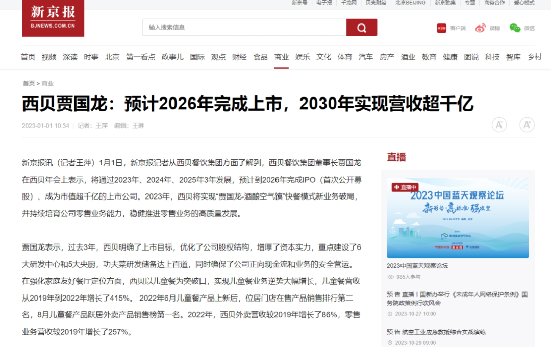 今年1月1日,《新京报》报道称,其记者从西贝餐饮集团方面了解到:西贝餐饮集团董事长贾国龙在西贝年会上表示,将通过2023年、2024年、2025年3年发展,预计到2026年完成IPO(首次公开募股)、成为市值超千亿的上市公司。
