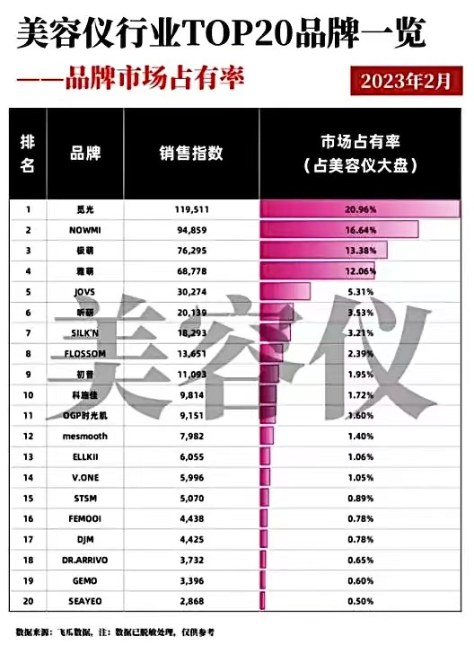 以市占率为计算口径,根据飞瓜数据显示,在今年2月的美容仪品牌市占率榜单中,前三名分别是觅光、NOWMI、极萌,其中,觅光、极萌为国产品牌。