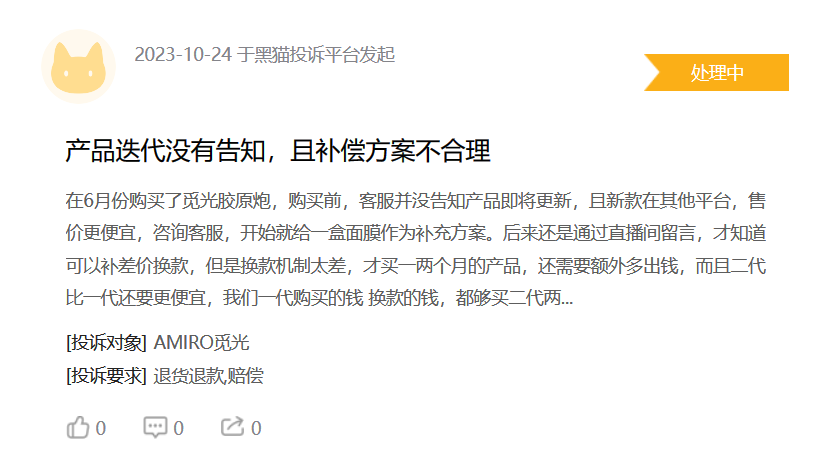 在黑猫投诉平台上,亦有消费者表示使用觅光产品导致脸部烫伤。