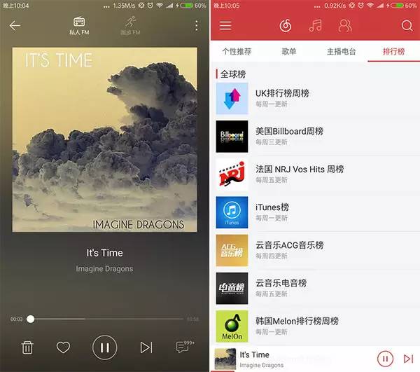 又因为网络的快速/及时性,在新消息的传播速度上电台总要落后这些网络软件不少。就拿音乐这个方面来说,以前的我们可能需要开电脑联网、听电台才能知道最新的音乐榜单,但现在只需要打开虾米音乐,网易云音乐等这类音乐软件,就能最快最全地获得音乐榜单信息,而且还能选择性地试听,比听电台这种被动式的试听场景便捷不少。此外,音乐的口味还能根据用户私人定制,我们再也不用受制于电台的节目播放时间,更能避免听到烦人的电台广告。