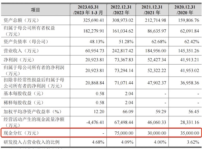 界面新闻记者注意到,恒达智控另一手却在持续大额现金分红。2020年至2022年,恒达智控现金分红金额分别为3.50亿元、3.00亿元和7.50亿元,三年合计分走14亿元。