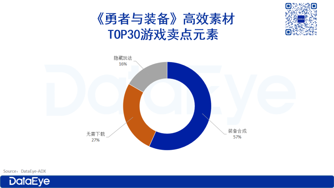 DataEye研究院对《勇者与装备》高效素材TOP30创意卖点要素进行分类。从数据来看,主要突出“装备合成”这个玩法,突出免费合成,占比超过半数以上。另外,高效素材还突出游戏“无需下载”“隐藏玩法”相关卖点。