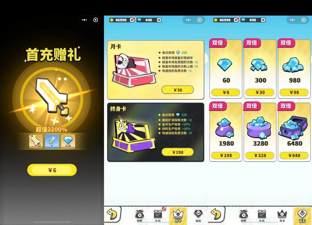 从氪金内容来看:《勇者与装备》加入了社交系统,例如世界聊天框、竞技场系统、工会、榜单系统等等,进而促进玩家之间的攀比欲望,刺激消费。在闯关失败时,会反复提醒有6元首充福利,氪金页面会发现,目前最高充值金额为698元。