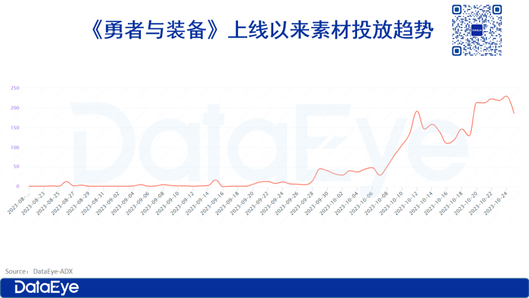 国庆小长假后,《勇者与装备》素材投放量快速攀升,日均保持在150-200组左右;目前投放力度基本已经与《一念逍遥H5》持平。