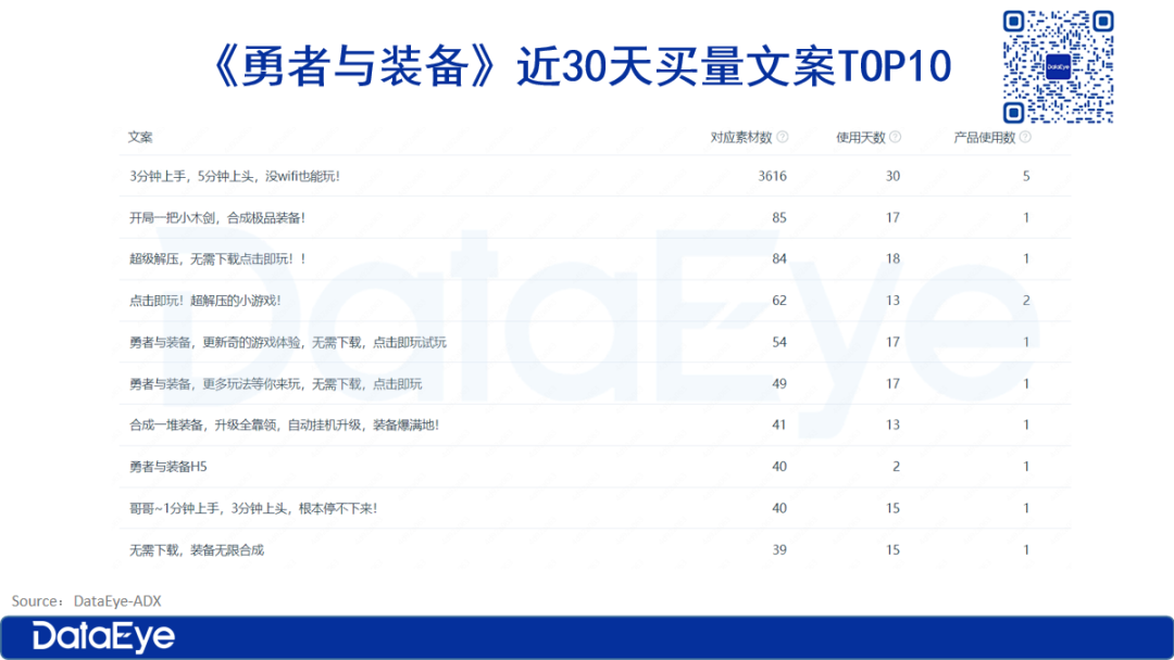 文案标题方面,“无需下载”和“合成装备”的使用率较高。“解压”、“容易上手”等特点也较高频次出现。
