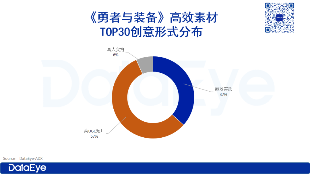 创意形式方面《勇者与装备》高效素材TOP30主要分为三种,分别为:“类UGC短片”“游戏实录”以及“真人实拍”。其中,“类UGC短片”和“游戏实录”合计占比高达94%,而真人实拍形式的素材占比约6%。