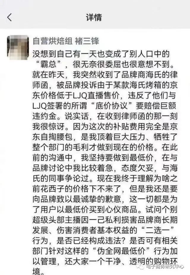 10月24日上午,京东采销人员“褚三锋”在朋友圈公开喊话李佳琦“二选一”。该工作人员称,收到烘培电器品牌海氏的律师函,其指控京东平台违约修改定价,导致公司产品的销售利润为零甚至负数,同时也造成海氏在与其他客户合作合同中的被动违约,可能触发巨额赔偿风险。
