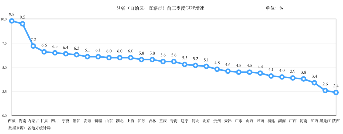 截至10月26日,全国31个省份(自治区、直辖市)前三季度经济数据悉数出炉,17个省份地区生产总值(GDP)跑赢全国5.2%的水平。西藏以9.8%的增速名列第一,海南紧随其后。