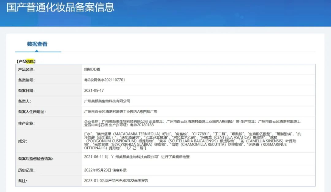 仪美尚查询发现,翊彤DD霜备案人为广州美颜美生物科技有限公司(下称美颜美公司),该公司成立于2018年4月,其旗下不仅有“翊彤”品牌,还注册了“懂美丽”“馨怡颜”“时润佳”“巧美妮”等一系列品牌商标。