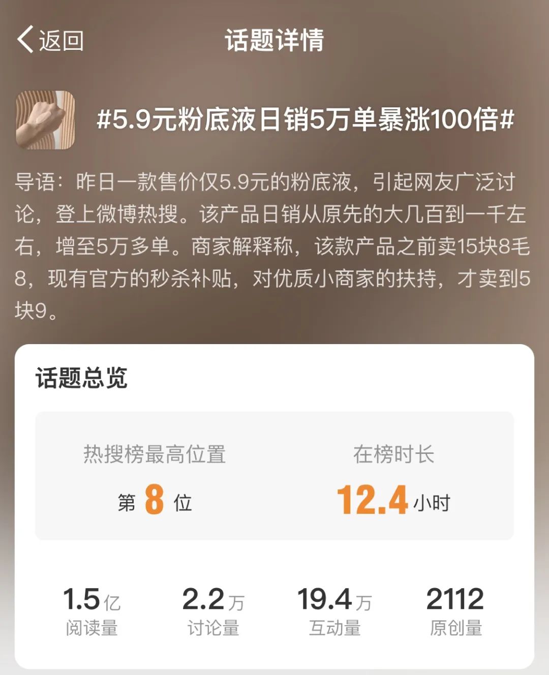 这些信息更加博得了粉丝好感,引发抢购潮。@飞仔joey视频发布两天后,#5.9元粉底液日销5万单暴涨100倍# 话题登上热搜,目前,该话题在微博的阅读量破1.5亿。