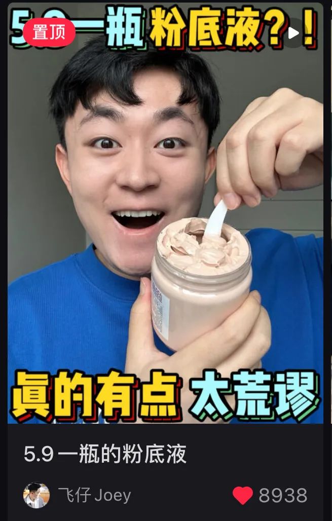 几天后,另一美妆博主@飞仔joey也对同款产品进行了测评,结果同样显示“妆效自然且可持妆7-8小时”,随后这条“5.9一瓶粉底液?!真的有点太荒谬”的视频走红。截至发稿,该视频在抖音平台的点赞量超7w,转发量超14w。