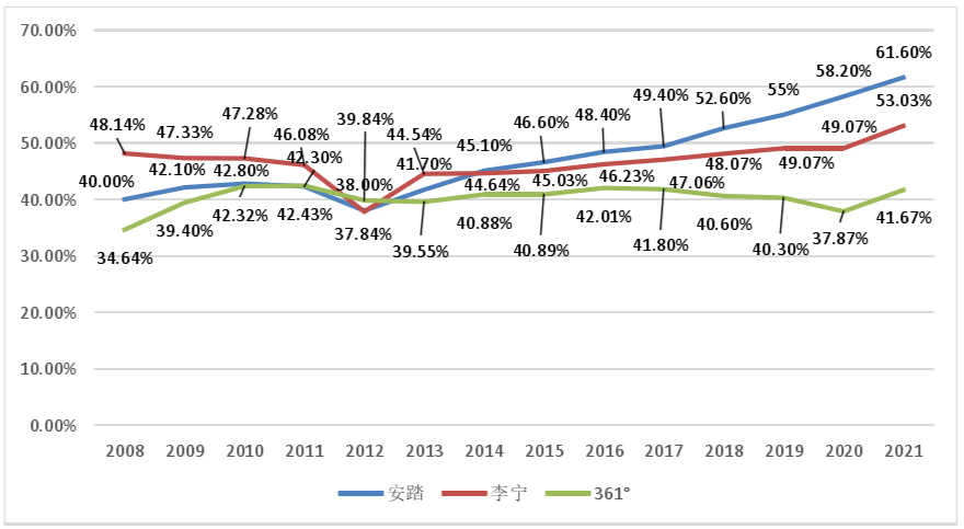 这种策略除带动上文所述并购品牌的增长外,也帮助安踏的毛利率从2015年的46.6%提升至2021年的61.6%,远高于李宁和361o同期的53.01%和41.67%。