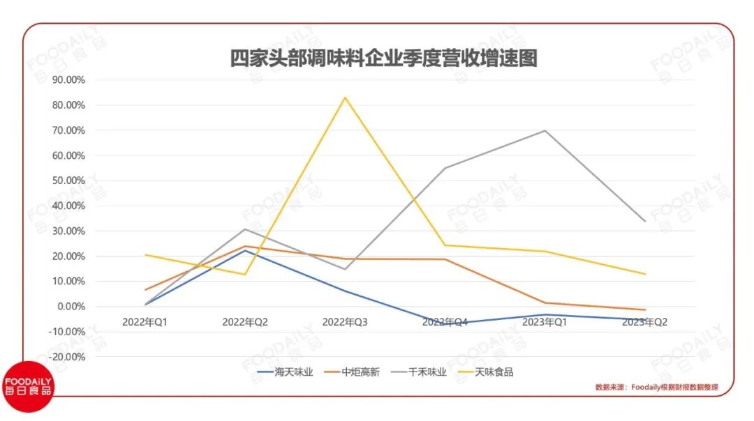 从上图可以看出,近一年来,在同赛道的四家头部企业中,海天的营收增速都低于其他三家(中炬高新、千禾味业、天味食品)。