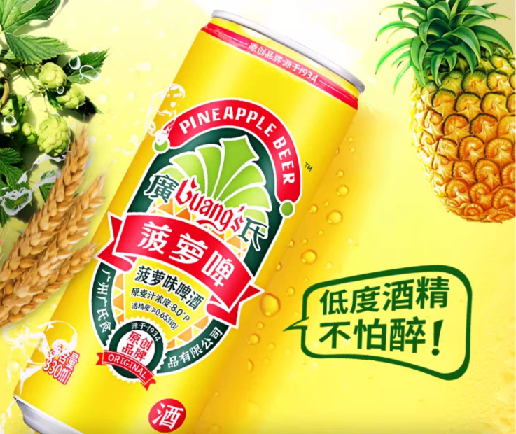 要知道,广东人被调侃为“全国最不能喝的省份”之一,而广氏菠萝啤的度数只有0.65,对比之下就连主打“微醺”的RIO酒精度数也有3度。