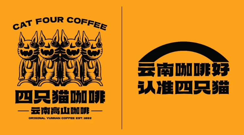 首先是品牌的形象,四只猫咖啡将云南的非物质文化遗产符号瓦猫加入到了logo中,并将猫咪项圈上的铃铛换成了咖啡豆;其次是品牌的口号,四只猫咖啡采用了“云南咖啡好,认准四只猫”的标语,既肯定了云南咖啡,又体现了品牌的自信。